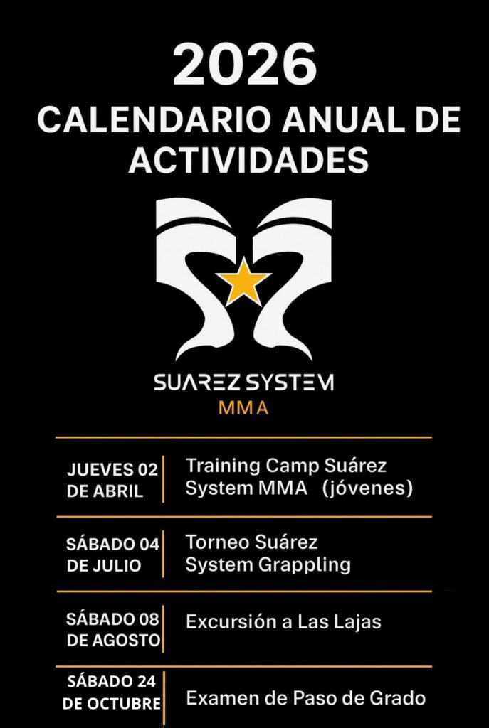 Publicamos el calendario anual 2026 , departamento MMA Suárez System , se celebrará un Capamento con los jovenes en la playa , duración 3 días , torneo interno de la escuela , excursión , pasé de grados anual
